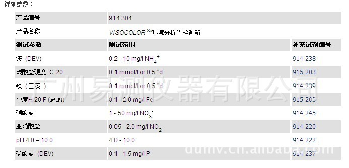德國MNVISOCOLOR®“環境分析”檢測箱,配有光度計PF-11,適用于不同環境的水質檢測。用于測定銨、碳酸鹽硬度、鐵、總硬度、硝酸鹽、亞硝酸鹽、PH值和磷酸鹽8種參數,可進行60-120次的測試,產品保質期至少為18個月。操作簡單、快速,即使是非專業的人員也能進行操作。非常輕便,可作為便攜式實驗室使用。是環境分析的理想產品。